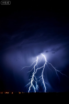 A dramatic night scene with thunder and lightning striking in the background. The lightning illuminates the dark sky, creating a burst of intense white light. The masterful composition captures the raw power of nature, with raindrops visible in the air. The frame is filled with dynamic movement, emphasizing the intensity of the storm.