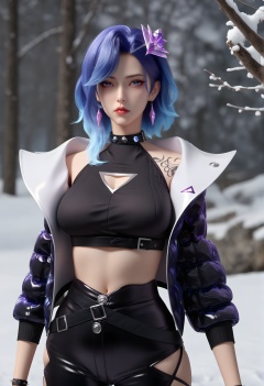 (score_9),<lora:想入菲菲-apony:0.83>,xrff,solo,1girl,blue hair,hair ornament,jewelry,earrings,<lora:Expressive_H-000001:0.8>,light blush,spoken heart,blue eyes,looking at viewer,front view,belt collar,gem,open jacket,crop top,black_crop top,clothing cutout,cleavage cutout,belt,fingerless gloves,shoulder tattoo,tight pants,black_tight pants,spiked bracelet,(mature_female:1.2),collarbone,pointy breasts,puffy breasts,(large teardrop breasts),groin,(mound_of_venus),navel,<lora:e肤色滑块:0.5>,fair_skin,(pale_skin),(white_skin),<lora:e色温:-0.35>,light skin,ultra-detailed skin texture,detailed textures,<lora:皮肤凹痕:1.2>,BREAKsimple background,in snow,Tyndall effect,available light,depth of field,tree,snowflakes,branch,twig,Tyndall effect,available light,depth of field,rock,4K ultra HD,sharp focus,high detail,natural lighting,high contrast,