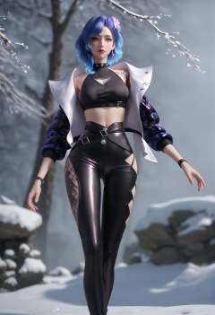 (score_9),<lora:想入菲菲-apony:0.86>,xrff,solo,1girl,blue hair,hair ornament,jewelry,earrings,<lora:Expressive_H-000001:0.862>,light blush,blue eyes,looking at viewer,front view,belt collar,gem,shoulder tattoo,open jacket,crop top,black_crop top,clothing cutout,cleavage cutout,spiked bracelet,belt,tight pants,high heels,anklet,mismatched_tight pants,spoken heart,dutch angle,dynamic_angle,(mature_female:1.2),collarbone,pointy breasts,puffy breasts,(large teardrop breasts),<lora:e肤色滑块:0.5>,fair_skin,(pale_skin),(white_skin),<lora:e色温:0.35>,light skin,ultra-detailed skin texture,detailed textures,<lora:皮肤凹痕:1.2>,BREAKsimple background,in snow,Tyndall effect,available light,depth of field,tree,snowflakes,branch,twig,Tyndall effect,available light,depth of field,rock,4K ultra HD,sharp focus,high detail,natural lighting,high contrast,