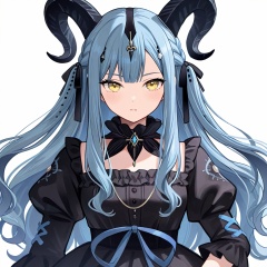 masterpiece, best quality,solo,(white background:1.2),simple background,1girl,looking at viewer, togawa sakiko,bangs,ribbon,hair ribbon,black ribbon,two side up,blue hair,grey hair,sidelocks,blunt bangs,yellow eyes,long hair,wavy hair,shirt, gloves,dress,pantyhose,boots,black gloves,black footwear,high heels,black pantyhose,thighhighs, dress,tail, horns, black dress,hair ornament,<lora:舟祥ill10:0.8>