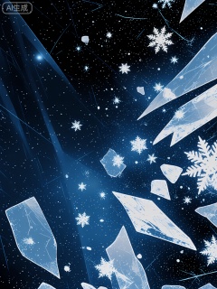 mesmerizing icy scene, deep blue and white, fragmented ice shards, sharp angular edges, sense of coldness, sense of fragility, various sized snowflakes, wintry atmosphere, dark background, almost black canvas, lighter blue spots, starry night sky, distant galaxies, fine wispy lines, frost patterns, ethereal quality, frozen stillness, otherworldly landscape, interplay light shadow, depth and dimension, serene and dynamic