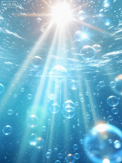 serene underwater scene, soft ethereal light, sunbeams pierce water, radiant glow, shimmering reflections, numerous bubbles float, sense of movement, gradient blue background, delicate translucent strands, dreamy quality, calm and beauty, magical interplay