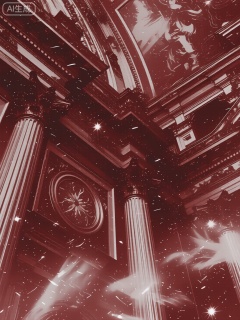 Ornate, grand interior, Rich, reddish hue, Elaborate columns, Intricate carvings, Ceiling frescoes, Decorative moldings, Circular panels, Rectangular panels, Artistic designs, Ethereal figures, Mystical element, Sparkling particles, Magical atmosphere, Opulence, Otherworldliness, Classical architecture, Fantastical elements, Dramatic lighting, Immersive experience