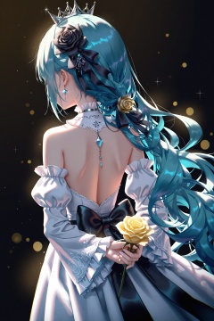 masterpiece,very aware,highres,absurdres,newest,best quality,petite,high quality,chromatic_aberration,cinematic_angle,dutch angle,photorealistic,//,artist:torino aqua,artist:rhasta,artist:wlop,artist:ke-ta,artist:hiten \(hitenkei\),//,best,1girl,solo,flower,dress,long hair,holding flower,holding,white dress,hair ornament,rose,detached sleeves,from behind,hair flower,jewelry,back focus,earrings,crown,bare shoulders,arms behind back,black background,very long hair,light particles,back,bare back,backless outfit,wide sleeves,cowboy shot,black ribbon,backless dress,aqua hair,frills,frilled sleeves,black flower,simple background,long sleeves,ribbon,hatsune miku,black rose,facing away,blue hair,detached collar,standing,glint,yellow flower,strapless dress,strapless,median furrow,white sleeves,bow,frilled dress,yellow rose,back bow,sparkle,backlighting,puffy sleeves,dark background,wavy hair,nape,black bow,collar,hair ribbon,<lora:[Alicia]konya2up-000024p:0.8>,