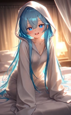 masterpiece,absurdres,best quality,high quality,chromatic_aberration,loli,petite,//,1girl,solo,long hair,blue eyes,blue hair,looking at viewer,pillow,hood up,hood,curtains,smile,sleeves past wrists,blurry,open mouth,lamp,hair between eyes,blurry background,indoors,on bed,very long hair,long sleeves,depth of field,sleeves past fingers,:d,arm support,bed,white robe,breasts,collarbone,robe,bokeh,teeth,blush,lens flare,bed sheet,canopy bed,small breasts,hooded robe,//,highres,HDR,8K,high contrast,illustration,depth of field,(colorful),Tyndall effect,contrast,lens flare,<lora:nyalia22——【noob】hans_bf16:1>,
