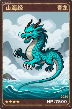 xskp,,像素艺术风格的游戏卡牌,呈现《山海经》中的神兽“青龙”。青龙为蓝绿色的龙形形象,正腾跃在有海浪和云雾的海面上方场景中。卡牌顶部左侧用特定字体显示“山海经”,右侧显示“青龙”;底部左侧显示四星评级,右侧显示“HP:7500”,右下角还有编号“0020”。卡牌带有木质纹理的边框,整体体现复古游戏的像素艺术美学,展现青龙的灵动与海洋、云雾场景的缥缈。
