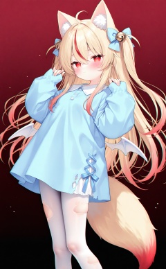 masterpiece,absurdres,best quality,high quality,chromatic_aberration,loli,//,1girl,animal ears,tail,blonde hair,fox ears,hair bell,solo,animal ear fluff,fox tail,white pantyhose,pantyhose,long hair,fox girl,red hair,torn clothes,red eyes,multicolored hair,torn pantyhose,hair bow,looking at viewer,virtual youtuber,long sleeves,sleeves past wrists,puffy long sleeves,bow,red background,bell,ahoge,hair ornament,streaked hair,two side up,dress,wings,mini wings,blue bow,blue shirt,hands up,very long hair,shirt,puffy sleeves,blue dress,blush,hair between eyes,closed mouth,jingle bell,gradient background,feet out of frame,standing,short dress,//,<lora:nyalia917——【NOOB】hans:0.8>,