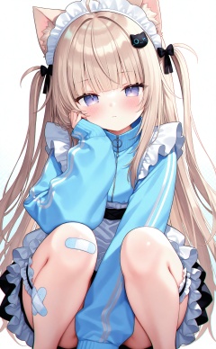 masterpiece,absurdres,best quality,high quality,chromatic_aberration,loli,//,1girl,bandaid on leg,unconventional maid,maid headdress,animal ears,track jacket,bandaid on knee,sleeves past wrists,bandaid,jacket,solo,blue jacket,sleeves past fingers,looking at viewer,long hair,maid,cat hair ornament,cat ears,bridal garter,long sleeves,squatting,blush,hair ornament,hand on own face,ahoge,hand on own cheek,animal ear fluff,purple eyes,closed mouth,apron,white background,blue eyes,blunt bangs,white apron,virtual youtuber,two side up,light brown hair,frills,very long hair,feet out of frame,simple background,cat girl,turtleneck jacket,maid apron,blonde hair,head rest,halftone,//,<lora:nyalia917——【NOOB】hans:0.8>,
