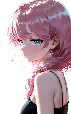 masterpiece,absurdres,best quality,high quality,chromatic_aberration,loli,//,1girl, solo, blue eyes, looking at viewer, white background, pink hair, long hair, simple background, sparkle, upper body, bare shoulders, breasts, jewelry, from side, earrings, closed mouth, spaghetti strap, tears, ponytail, medium breasts, signature, lips, crying, parted lips, black camisole, low ponytail, expressionless, hair over shoulder, sleeveless, eyelashes//,<lora:nyalia917——【NOOB】hans:0.8>,