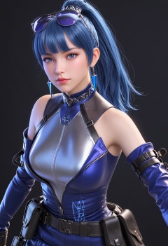 (upper_body:1.2),(looking at viewer:1.1),facing viewer,direct gaze,<lora:YQ_pony_wumengmeng_V4:0.8>,1girl,q1528437228,solo,blue hair,eyewear on head,earrings,gloves,jewelry,ponytail,detached sleeves,long hair,pantyhose,belt,dress,holster,blunt bangs,black hair,jacket,brown eyes,thigh holster,collar,sleeveless,blue eyes,skirt,blue dress,grey eyes,belt pouch,thigh strap,BREAK (simple background,pure black background,black background:1.1),perfect anatomy,