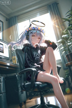 masterpiece,very aware,highres,absurdres,newest,best quality,petite,high quality,chromatic_aberration,cinematic_angle,dutch angle,photorealistic,//,artist:torino aqua,artist:rhasta,artist:wlop,artist:ke-ta,artist:hiten \(hitenkei\),//,1girl, solo, long hair, looking at viewer, bangs, hair ornament, long sleeves, sitting, yellow eyes, ponytail, white hair, sidelocks, barefoot, indoors, hood, feet, bare legs, window, hoodie, toes, headphones, halo, chair, x hair ornament, plant, desk, knee up, can, potted plant, computer, monitor, keyboard \(computer\), office chair, mouse \(computer\),//,official art,depth of field,detailed light,blurry background,cinematic lighting,ray tracing,ultra detailed,god rays,backlighting,photo background,film grain,chromatic aberration,volumetric lighting,depth of field,blurry background,shiny skin,floating hair,cinematic lighting,day,very aesthetic,cowboy shot,look up,head wreath