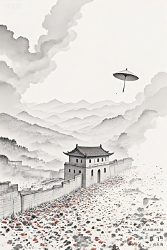 新中式,一个传统的中国风景,背景中有薄雾的山脉。在前景中,有一个带有中国传统建筑的石墙,包括守望台。地面上覆盖着散落的红色和黑色岩石,空中漂浮着大的雨伞,类似于中国传统的阳伞。天空充满了云,整体调色板是单色的,带有灰色和黑色的阴影。 图像中的文字用英语和中文编写。它读取: “@天海“ 该图像是一种风格化的插图,将中国传统元素与现代艺术技术相结合。