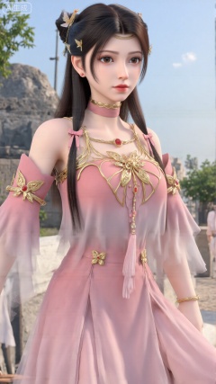 1girl, solo, dress, pink dress, hair ornament, long hair, jewelry, brown eyes, bracelet, flower, mischevious smile, perfect body, scenery, sharp focus, best quality, masterpiece, detailed outfit, illustration, perfect eyes, finely detailed beautiful anime eyes, realistic skin, intricate details, best lighting, depth of field, ultra high resolution,sitting