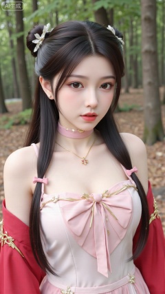 1girl,solo,jewelry,flower,hair flower,hair ornament,necklace,realistic,brown eyes,looking at viewer,dress,blurry background,twin braids,blurry,white dress,long hair,upper body,breasts,pink bow,red jacket,bare shoulders,lips,collarbone,outdoors,cleavage,large natural breast,soft breasts,huge Breasts