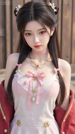 1girl,solo,jewelry,flower,hair flower,hair ornament,necklace,realistic,brown eyes,looking at viewer,dress,blurry background,twin braids,blurry,white dress,long hair,upper body,breasts,pink bow,red jacket,bare shoulders,lips,collarbone,outdoors,cleavage,large natural breast,soft breasts,huge Breasts