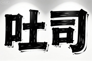 A close-up shot of a large, bold "吐司" written in black ink on a white background. The text is centered with strong, sharp lines. Lighting is bright, highlighting the contrast between the black letters and the white space. The composition focuses solely on the text, creating a clean, impactful design.,涂鸦字