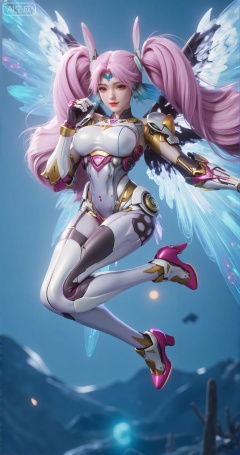 Her armor features intricate patterns and glowing accents, giving it a high-tech, almost organic appearance. She has long, pink twin-tails that are flowing dynamically, adding a sense of motion to the image