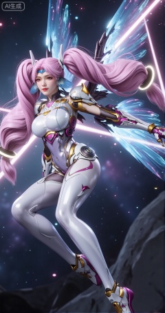 The character has long, flowing pink hair styled in twin tails, with a bright pink headband