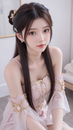 1girl, solo, long hair, breasts, looking at viewer, smile, bangs, dress, bare shoulders, jewelry, sitting, very long hair, closed mouth, white dress, bracelet, Light, shadow