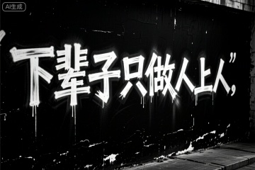 A black background with white graffiti text reading "下辈子只做人上人". The graffiti is spray-painted in bold, angular letters, creating a stark contrast against the dark backdrop. The composition focuses on the text, with the words slightly tilted to one side, giving a dynamic feel. The lighting highlights the text, casting shadows around the edges, adding depth and intrigue. The scene feels raw and urban, with the words seemingly emerging from the darkness.