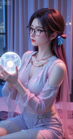 Real photography, high quality, masterpiece, cyberpunk style, a girl with light makeup, wearing rimless glasses, pink and gray hair, tied up, transparent tulle clothes, wearing a transparent tulle off-shoulder sweatshirt and sweatpants , sitting on the bed, turning sideways, the clothes are decorated with pink lightning-shaped luminous lines, and the luminous words "Super" are written on the chest and abdomen of the clothes. Agent", wearing a blue and white luminous collar around her neck, cyberpunk style, holding a transparent light ball in her hand, with lightning emitting from the center of the light ball, the girl's glasses looked at the transparent light ball in her hand, thoughtfully expression, the whole room is rendered with pink and blue light and shadow, cyberpunk style, sense of technology, close-up, real light and shadow effects, professional composition,