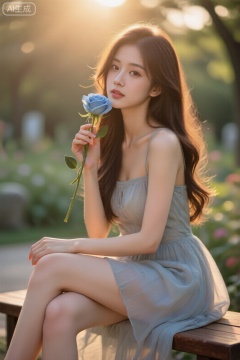 超现实温暖的电影全身拍摄摄影,柯达专业波特拉160,1个女孩,looking_at_viewer,,大长腿,逼真,,照片姿势,动态姿势,,eluosi ,良好解剖结构,真人肌肤纹理, 4K画质,完美身材, 这张照片描绘了一位年轻女子坐在木凳上,手里拿着一朵蓝玫瑰。 她穿着一件无肩带连衣裙,头发垂下来,波浪造型宽松。 她的皮肤白皙,眼睛是深棕色的。她用右手把花举到脸上,左臂放在身边。 图像的背景是模糊的,但它似乎是一个户外环境,可能是一个公园或花园,在阳光明媚的日子里。 这张照片的气氛浪漫而亲密,暗示着这个女人可能在庆祝一个特殊的时刻,或者只是在享受一个安静的时刻。,千问佳人