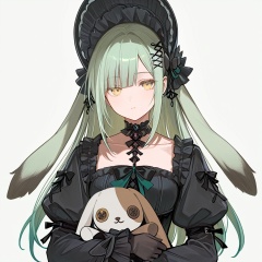 masterpiece, best quality,solo,(white background:1.2),simple background,1girl,looking at viewer, Wakaba Mutsumi,long hair,green hair,bangs,blunt bangs,yellow eyes,hair ornament,hairclip,blonde hair, gloves, long sleeves, dress, bow,flower,boots,frills, choker, black gloves,black footwear,black dress, black headwear,black bow, black choker,stuffed toy,frilled dress, knee boots, stuffed animal, lolita fashion, bonnet,collarbone,thighhighs,hat,jewelry,puffy sleeves,black thighhighs,high heels, gothic lolita, stuffed bunny,Lop Ear,animal ears<lora:舟睦1ll10:0.8>