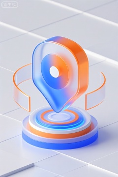 B端图标,磨砂玻璃纹理,透明技术感,等长透视,白色背景,工作室灯光效果,明亮的颜色,3D艺术,C4D建模,OC渲染,The image depicts a modern, stylized 3D illustration of a location pin icon. The pin is composed of a blue and orange geometric shape, placed on a circular platform with a glowing blue ring around it. Surrounding the pin are two transparent, curved structures that appear to be floating or hovering, adding a futuristic feel to the design. The background consists of a smooth, white, grid-like surface that enhances the sleek, high-tech aesthetic of the image. The overall design is clean and minimalistic, with a focus on the central icon.