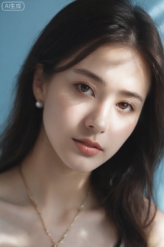 1girl, solo, looking at viewer, brown hair, black hair, hair between eyes, brown eyes, jewelry, collarbone, earrings, necklace, black eyes, lips, blue background, portrait, realistic, nose.
