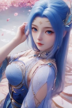 score_9,score_8_up,score_7_up,1girl,solo,long hair,looking at viewer,blue eyes,hair ornament,jewelry,dress,blue hair,blue dress,petals,hand in own hair,portrait,from above,pov