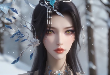 (score_9),portrait,(close-up),solo focus,(eye focus),<lora:云望舒-apony:0.83>,yunwangshu,1girl,solo,yellow eyes,long hair,hair ornament,black hair,updo,hair bun,mole under eye,eyeshadow,makeup,<lora:Expressive_H-000001:0.8>,front view,looking at viewer,<lora:e肤色滑块:0.35>,fair_skin,(pale_skin),(white_skin),light skin,ultra-detailed skin texture,detailed textures,BREAKsimple background,in snow,Tyndall effect,available light,depth of field,tree,snowflakes,branch,twig,4K ultra HD,sharp focus,high detail,natural lighting,high contrast,