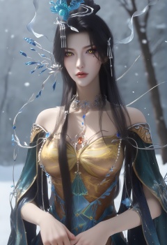 (score_9),<lora:云望舒-apony-000009:0.83>,yunwangshu,1girl,solo,yellow eyes,long hair,hair ornament,black hair,updo,hair bun,mole under eye,eyeshadow,makeup,metal collar,chest jewel,detached sleeves,dress,<lora:Expressive_H-000001:0.8>,light blush,front view,looking at viewer,mature female,collarbone,pointy breasts,puffy breasts,((large teardrop breasts)),cleavage,<lora:e肤色滑块:0.35>,fair_skin,(pale_skin),(white_skin),light skin,ultra-detailed skin texture,detailed textures,BREAKsimple background,in snow,Tyndall effect,available light,depth of field,tree,snowflakes,branch,twig,4K ultra HD,sharp focus,high detail,natural lighting,high contrast,