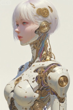 ysmx,对称构图,杰作,最佳质量,高度细节,数字艺术风格。主体是一位拥有白色短发的机械人形(安卓),头部有金色齿轮状发饰,颈部与肩部裸露复杂的金色机械结构(包含精密齿轮、彩色线路、金属活塞等),白色装甲外壳上带有细腻的光泽与细微磨损质感,整体融合了赛博朋克的科技感与传统工艺的精致感,背景为简洁的浅色调,光线柔和,突出机械部件的金属光泽与纹理层次。