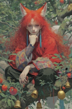 ysmx,杰作,最佳质量,高度细节,国风奇幻风格。主体是一位带有红狐耳、红色卷发的人物,身着红色传统服饰(袖口带有复杂的彩色刺绣,图案含龙纹等元素),搭配蓝色流苏耳环;坐在枝叶繁茂的树枝上,周围点缀金色铃铛、红色果实(如柿子)等装饰;背景是绿色的树叶,整体色彩鲜艳,细节精致,光线柔和,突出毛发的蓬松感、服饰的刺绣质感与场景的灵动感,营造出神秘的东方奇幻氛围。