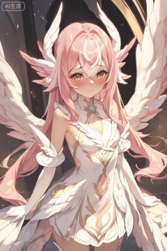 score_9,score_8_up,score_7_up,1girl,solo,long hair,breasts,looking at viewer,blush,gloves,dress,hair between eyes,pink hair,white hair,multicolored hair,small breasts,wings,sleeveless,elbow gloves,white gloves,white dress,clothing cutout,head wings,white wings