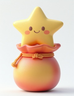 Chibi 3D,一个卡通风格的可爱星星形象,黄色五角星带有微笑表情和红色腮红,星星坐在一个渐变橙红色的球型布袋上,布袋用橙色绳子系紧,绳结和袋口细节圆润,整体色彩以明亮的黄色和橙红色为主,没有文字,构图以星星和布袋为中心,背景纯白色突出主体,材质表现为光滑的塑料或软陶质感,表面带有柔和高光和渐变,整体风格童趣,治愈,温暖,极具亲和力和视觉吸引力,, Negative prompt: ng_deepnegative_v1_75t,(badhandv4:1.2),EasyNegative,(worst quality:2),,nsfw, Steps: 30, Sampler: Euler, CFG scale: 4.0, Seed: 368681162, Size: 1140x1472, Model hash: 98763a1277, Model: Qwen-Image_1.0.safetensors, Denoising strength: 0, RNG: CPU, Lora 1: 姑苏-3D磨砂质感IP设计, Lora Hash 1: 2a8f06d929, Lora Weight 1: 1.0, vae_name: automatic