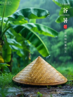 saessjq,画面背景是雨中葱郁的绿色芭蕉林,宽大的芭蕉叶在雨幕中摇曳生姿。前景是一个放置在地上的、还带着雨滴的竹编斗笠。画面右侧竖向排列文字“二十四节气谷雨2025/04/20 传统节气谷雨如丝复似尘” ,与左侧的斗笠和芭蕉林形成视觉平衡,营造出谷雨时节湿润且充满生机的氛围,景深突出前景斗笠的质朴纹理与背景芭蕉林的朦胧葱茏。