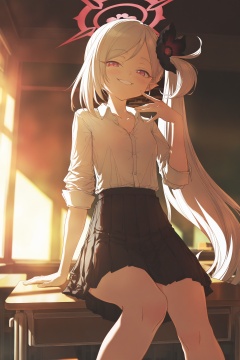 blue archive,mutsuki (blue archive),1girl,long hair,white hair,side ponytail,pointy ears,red eyes,halo,red halo,smile,smug,looking at viewer,sitting,on desk,school desk,desk,white shirt,shirt,shirt tucked in,skirt,pleated skirt,black skirt,flower,black flower,solo,classroom setting,soft lighting,rim light,glowing halo,ambient glow,warm atmosphere,detailed background,masterpiece,best quality,<lora:光辉V1正则miv4t画风V4-000012:0.8>,mivhuafeng,