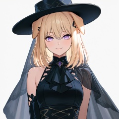 masterpiece, best quality,solo,(white background:1.2),simple background,1girl,looking at viewer,         Misumi Uika,blonde hair bangs,purple eyes,smile,medium hair,hair between eyes,gloves,hat,dress, animal ears, bare shoulders, flower, boots, black gloves,black footwear, black dress, high heels, black headwear,hair ornament,sleeveless,elbow gloves,dog ears,sleeveless dress<lora:舟uika-ill10:0.8>