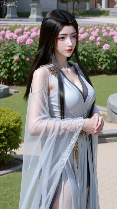 (masterpiece:1.2),best quality,,A woman adorned in traditional Chinese attire,( dress,black long hair),featuring a flowing robe with intricate embroidery and floral accents. A garden filled with pink roses and lush greenery. Soft pastel hues of white,blue,and green,creating a serene atmosphere. Photorealistic photography.,(huge breasts:2.99),(full breasts:2.99),,Xbigbreasts,XbaifengsongyuYH,XzhenniteH,XliuyuH,XfenghuangqipaoXF,XfenghuangqipaoXF,Xyuanyaohongqun,Xyuanyaomuyu,Xyuanyaoxizao,Xyuanyaohongyi