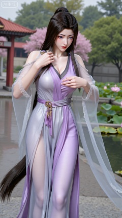 (masterpiece, best quality:1.2),1girl, navel, solo, midriff, bare shoulders, hair ornament,(long hair),(High double ponytail:1.19), red lips, BREAK, (looking at viewer:1.39), chinese clothes,(Holographic Color long dress:1.36), (lace,Rainbow Gradient Color:1.28), BREAK,blurry, solo focus, long hair, lips, daytime, lipstick, outdoors, standing,upper body,(huge breasts:2.89), background, solo, makeup,(Stockings, high heels:1.29),(huge breasts:2.99),(full breasts:2.99),,(Background with lotus pond and pink lotus flowers:1.39),,Xbigbreasts,XbaifengsongyuYH,XzhenniteH,XliuyuH,XfenghuangqipaoXF,XfenghuangqipaoXF,Xyuanyaohongqun,Xyuanyaomuyu,Xyuanyaoxizao,Xyuanyaohongyi
