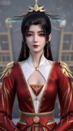 1girl, red dress, solo, hair ornament, black hair, chinese clothes, earrings, dress, jewelry, long sleeves, long hair, mischevious smile, perfect body, scenery, sharp focus, best quality, masterpiece, detailed outfit, illustration, perfect eyes, finely detailed beautiful anime eyes, realistic skin, intricate details, best lighting, depth of field, ultra high resolution,cowboy_shot