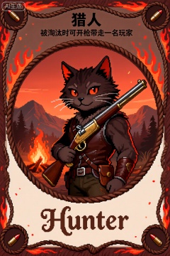 mxxskp,风格为西部冒险像素风,以棕红为主调营造荒野猎人氛围。中间是圆形棕色绳索边框,内为持猎枪的黑猫猎人,背景橙红荒野(含篝火、山脉);圆形边框由棕色绳索与火焰花纹构成,充满西部野性。像素外框整体是棕红色绳索与火焰外框,顶部、底部饰棕色绳索,两侧为红色火焰,四角嵌子弹图案,强化猎人冒险主题。字体上,上方中文“猎人” 是黑色方正黑体,清晰醒目;技能说明“被淘汰时可开枪带走一名玩家” 是黑色宋体,易读;下方英文“Hunter” 为棕色装饰性花体字,笔画带西部手写感,像素块契合荒野氛围。