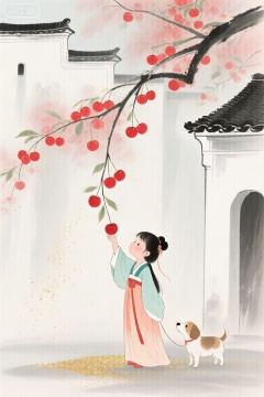 细腻的线条,徽派建筑白墙黛瓦,满树红红的樱桃枝垂下来踮起脚想摘樱桃的古风小女孩,可爱美丽手绘风插画,水墨画,水墨淡彩,湿墨晕染,大面积晕染,大写意,撒金粉,极具观赏性,颗粒感,层次感,艺术插画,明显的磨砂颗粒质感,朦胧感,晕开的笔墨触感,细腻的金箔粉岩彩,烫金丝线纹理,低饱和度色彩,淡雅柔和,有一个小狗跟着她