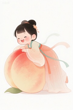 中国古风Q版卡通漫画风格,超级可爱古代小女孩,穿着广袖流仙裙,趴在一个巨大的水蜜桃上,正侧面照,仙气飘飘,人物小点儿,表情是开心俏皮的,半身照,整体和谐,水彩风格,幻,白色背景,配色和谐,暖色系水彩晕染,大面积留白