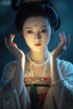 ,唐韵,风格为中式怪诞风格。质感逼真,整体兼具艺术感,大透视,杰作,最佳品质,8K分辨率,超精细插画,光影细腻,色彩层次丰富,材质表现细腻一个五官精致的古装美女,皮肤珠光,双手举着,暖光与周围冷色调形成强烈对比,照亮手部与部分颈部