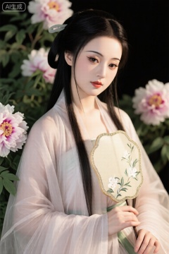 ,唐韵,古风美女肖像,精致细腻,细节丰富,薄纱质,光线细腻,质感很好,丹凤眼,长睫毛,手拿宫扇,笔触细腻,细节勾画,长发飘飘,在牡丹花从中,人与背景的明暗对比,突出人物,色彩搭配