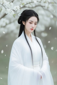 ,唐韵,大师级作品,最高质量,极其精细,一位绝色清冷的古风仙子,肤色雪白,气质清艳脱俗,眼眸含情略带忧伤,长发部分挽起,身着【月白色轻纱齐胸襦裙】,披帛飘逸背景是梨花墙,梨花如雪,纷纷扬扬地飘落,营造出静谧梦幻的氛围女子绝美的脸庞,清澈空灵