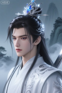 ,国风奇幻武侠, 古风绝世美男子,侧光。头戴星冠,镶天蓝水晶,描绘出水晶及星冠质感立体的五官,不要游戏人物风格头发描绘出细致的高光,光影的对比。国字脸型,剑眉,描绘细致,眼睛描绘出高光,眼影,挺直的鼻梁,描绘出高光,过渡色, 迷人的嘴唇,也需要描绘出高光,冷峻。 衣服是白丝绸,银刺绣暗纹。描绘出丝绸质感。背景是淡淡的国画背景,国风渲染气氛,淡淡烟雾。光影弥散,高清,OC渲染