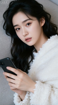 A super high-quality beauty, with long hair covering half of her face, cold and white skin, she is indifferent to life. Looking at her mobile phone, her facial features, close-ups, finely portrayed, dark light, sofa, realistic, photo, movie texture, sadness, high-definition, master quality photos, the medium-scene lens retains the scene atmosphere and highlights the characters, and light and shadow outline the outline of the characters, highlighting the texture of the clothing and the gloss of the accessories, and color contrast (character clothes and background light) enhances the visual focus, conveying a high-end and fashionable style.